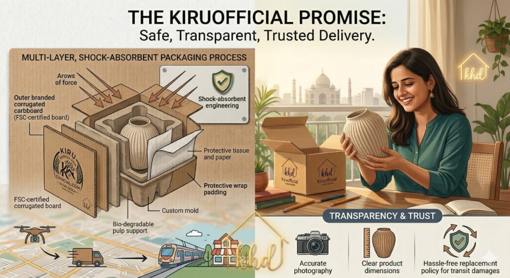 *Uncompromising Packaging:* We have engineered a multi-layer, shock-absorbent packaging process. Whether you live in a bustling metro or a quiet town, we ensure your delicate ceramic and glass pieces arrive in absolute pristine condition.